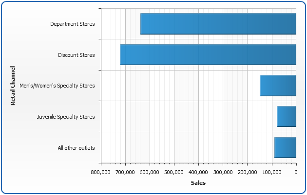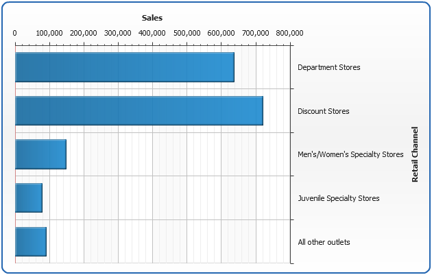 Let's see single series bar chart created using the following data - sales of ACME Corp. apparel through different retail channels in one year: