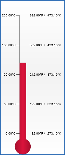 Let's create a thermometer that will show temperature by Celsius, Fahrenheit and Kelvin. Lets make the main axis show Celsius degrees. We need to define major_interval, minimum and maximum for the scale: