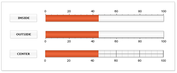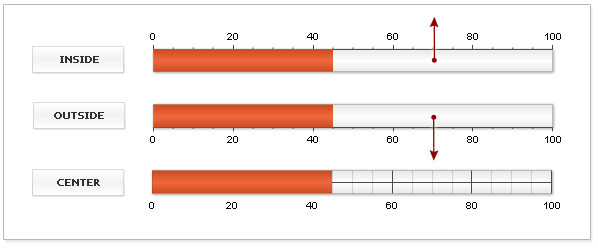 Axis size and position affects aligns of all elements an a gauge: labels, tickmarks, pointers, color ranges, tickmarks, etc. Whenever you set: align="Inside" you set "Inside" of axis bar, which means "Below" when we speak about horizontal gauges. Align are discussed in details later in this article.