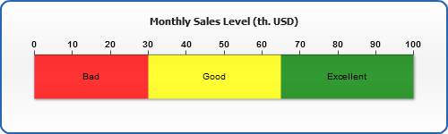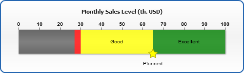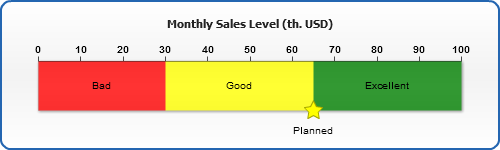 Now the current sales level is shown, as you can see from the syntax you can place several pointers on one gauge, they can be of a different shape and placed differently (this fact, by the way, allows to create the Bullet Graphs with AnyChart easily):