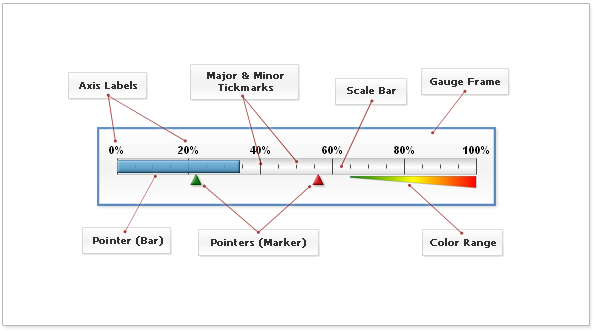 Linear gauge can have several pointers of a different types (although some of them are hardly compatible), several color ranges, several axes with configurable scale, axis markers and so on. Please study an image below to see the basic parts of linear gauge. The only difference between vertical and horizontal linear gauge is the orientation attribute, we will demostrate everything using horizontal one.