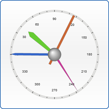 Second needle will be shorter than others ("80" value for radius attribute) and will be thickened near its This is done by setting point_radius to "10" and making point_thickness more than thickness. XML for the second needle pointer style: