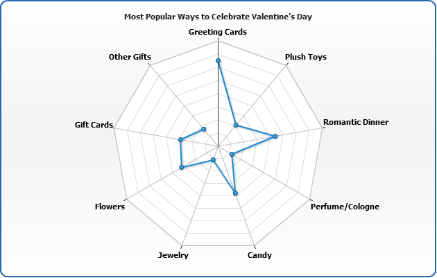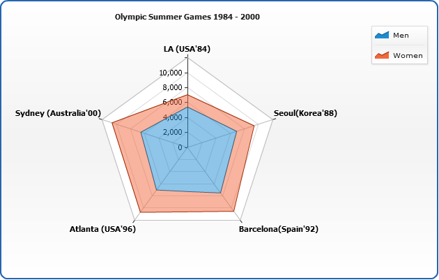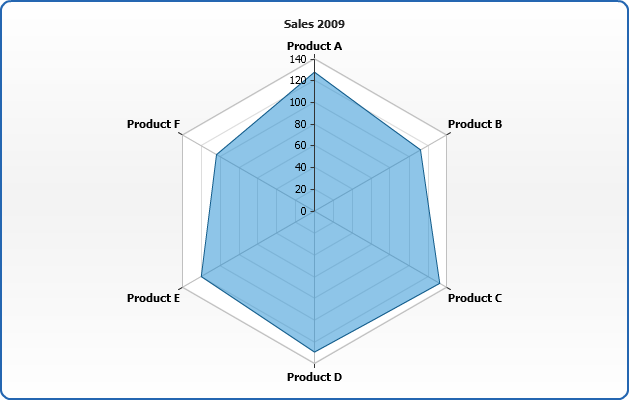 AnyChart allows to display three types of series on Radar chart: Line, Area and Marker. You need to set plot_type="Radar" in<chart> to display Radar chart: