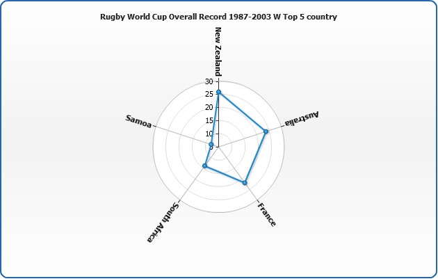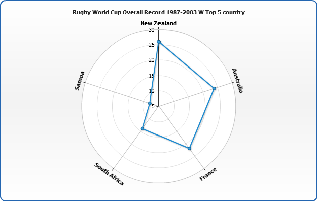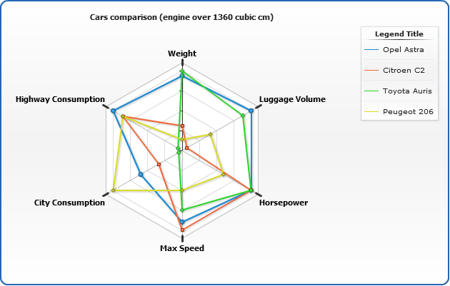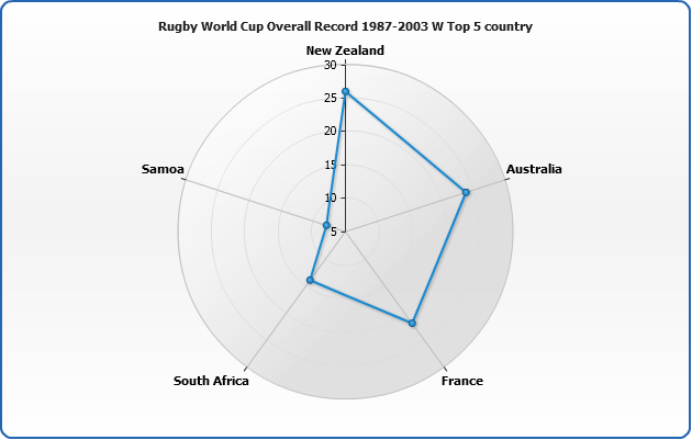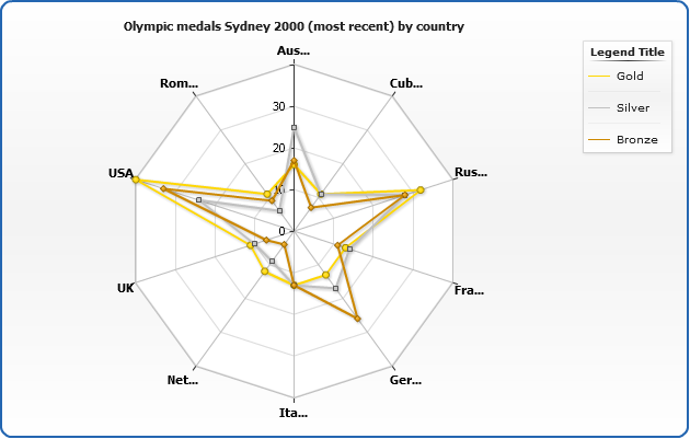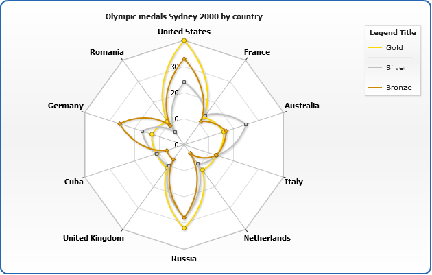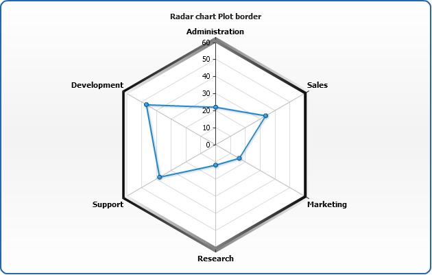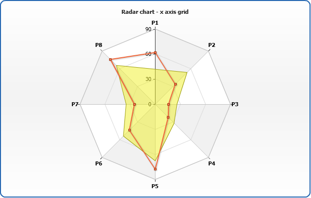 Another special feature of Radar chart is an ability to set whether data series are displayed under or above axes lines. This is set using display_data_mode attribute, which can be either "AboveAxes" (default) or "UnderAxes".