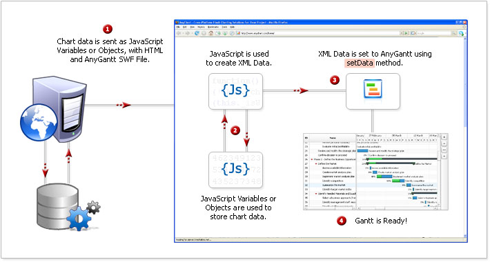 AnyGantt gets data from ANY sources (1), process it on ANY platform (2), creates ANY types of chart (3), and shows it in ANY client’s environment (4).