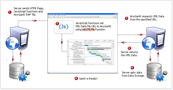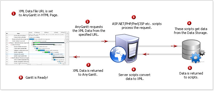 AnyGantt gets only XML data to configure the charts. You can provide physical XML files or dynamically create XML data using server-side or client-side scripts to AnyGantt Component.