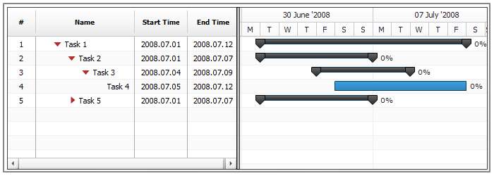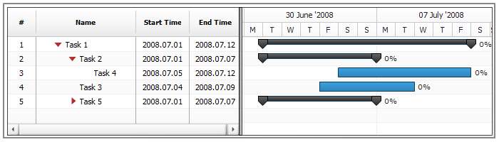 Summary tasks not only look different, but also - expand/collapse icon appears against it in the datagrid. You can control if the summary task is expanded or collapsed by default, using expanded attribute of task node. Both sample above show expanded and collapsed by default tasks.