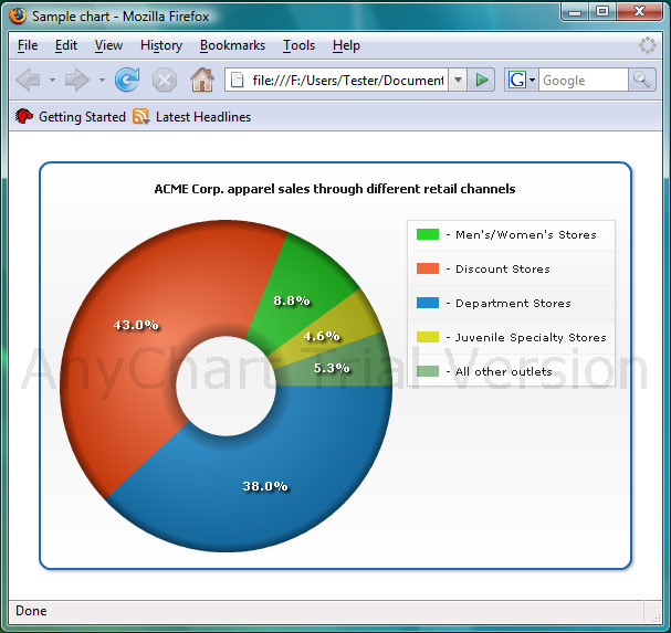 Using AnyChart with PowerPoint presentationsContentsIntroAnyChart is a flexible component for creation charts not only for Web, you can use AnyChart in PowerPoint as well. We will show how to embed chart into a presentation in the following tutorial. It is assumed that you've already created an XML file that configures the chart. Create and Save PowerPoint presentationCreate new PowerPoint presentation and save it to some folder on your computer. You can store XML and SWF files where you want to. In our sample we will use the doughnut chart: