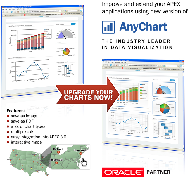 Using AnyChart products with Oracle Application Express (APEX)AnyChart and APEX Evangelists introduce an integration kit for new versions of our product. APEX Evangelists (AE) is an Oracle Partner company which 100% specializes in working with Oracle Application Express. Apex Evangelists are extremely knowledgeable in all areas of Application Express development and have extensive experience of working with the AnyChart products. How it works: 1. You contact APEX Evangelists to describe the details about your task and get the first advice about the integration. 2. APEX Evangelists provide you a special discount coupon code to purchase AnyChart products. 3. After purchasing AnyChart you contact APEX Evangelists to get the integration kit and start the process. Contact us now (email goes to both AnyChart and APEX Evangelists)>>