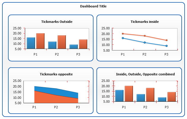 Tickmarks are the small marks used to represent a point on an axis scale, there are major and minor tickmarks, first used to indicate major step of an axis scale, second - minor step. You can control their appearance and position. To enable/disable tickmarks set enabled="True" or enabled = "false" to <major_tickmark> or <minor_tickmark>
