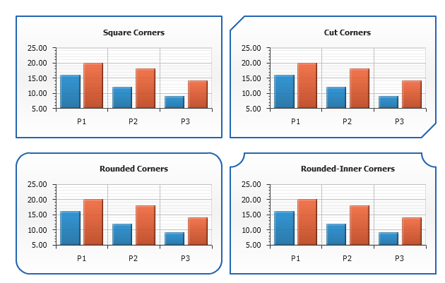 You can adjust the shape of borders corners, there are 4 types for corners: "Square", "Rounded", "Cut" and "RoundedInner". Appearance of these types is shown on the image below: