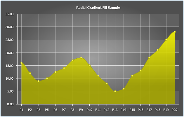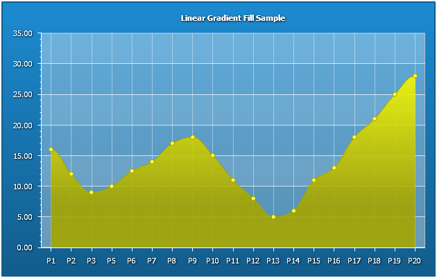 The sample below demonstrates how gradient fill can be used to create really attractive area chart, if you will take a closer look at this chart configuration XML you will see that sometimes color is defined as "DarkColor(#1D8BD1)" or "DarkColor(%Color)" - these are color transformation functions and color parameters, to understand what they are and how they can be used please refer to Color management tutorial.