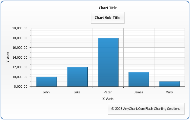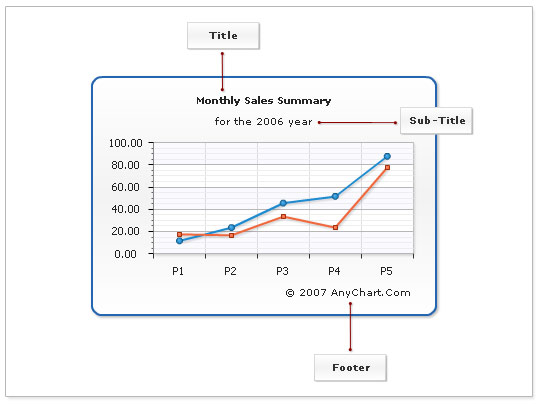 Every chart in AnyChart can have three "titles", they are <title>, <subtitle> and <footer>. These text fields are used to create description for the chart data. By default, <title> and <subtitle> are placed on the top of the chart, one above another, and <footer> in the bottom right corner.