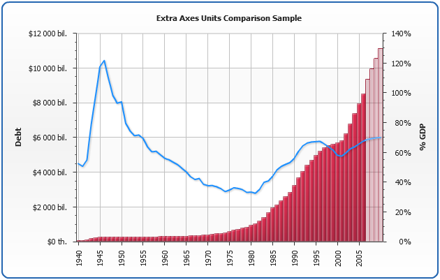 Lets see how extra axes can be used to show different data on the same plot: we will plot a US Debt amount in dollars and in percents of GDP. We need to create to axes: