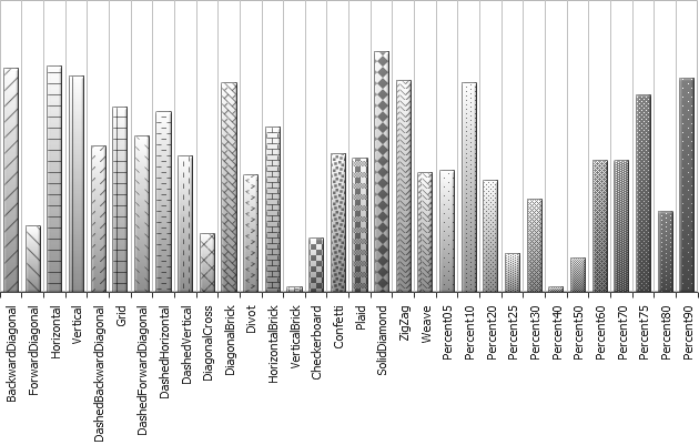 Predefined hatch palette includes all possible hatch fill types and named "Default", on the sample below you can see the result of its application to the single-series chart: