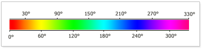 The number of the keys in gradient is unlimited and you can set any color sequence for interpolation. Moreover you can adjust color key position using position attribute of <key> node (position varies from 0 to 1). To show this option we will make another sample. Using Hsb(h,s,b) function (see Coloring Methods to learn what it is) we will add 12 keys into gradient changing only color hue (+30 degrees for each new key). As a result we will get gradient shown on the picture below, where each tickmark corresponds to a key into gradient settings: