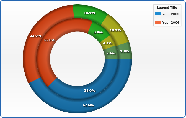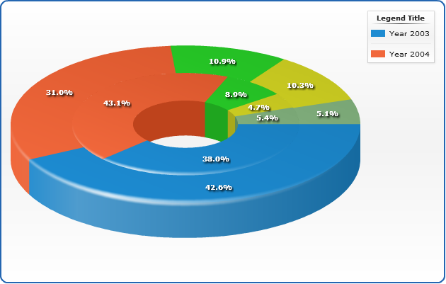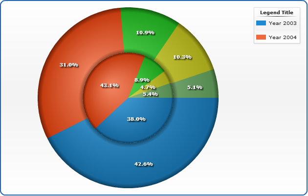 "style1" will be applied to "Year 2003 " series, "style2" will be applied to "Year 2004" series and "style3" will be applied to the pie with a highest value (Note - we will find highest value and set its style manually in this sample. But with AnyChart it is possible to do that automatically using Thresholds, read more about it in Thresholds tutorial).