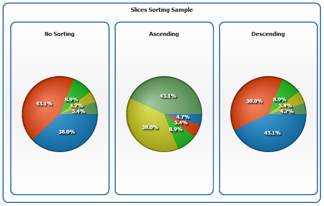 If you want you can sort the series in Pie and Donut Chart - Ascending or Descending, this feature is controlled using sort attribute of pie_series. In the sample below three pie charts with identical series are shown, first isn't sorted, the second is sorted ascending and the third - descending.