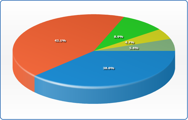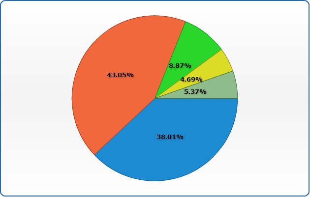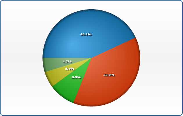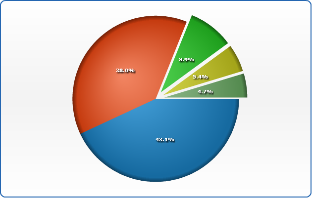 All we need to do to finalize pie chart XML creation is to define plot_type="Pie" in <chart> node. Here it is - AnyChart can now visualize your data. Look at the chart sample below and click on on it to see Live Flash Chart preview and full configured XML.