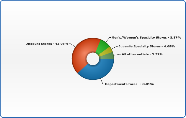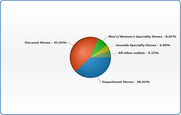Let's see single series pie chart created using the following data - sales of ACME Corp. apparel through different retail channels in one year: