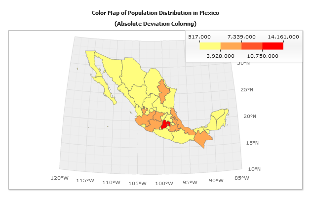 The sample below shows population map with colors assigned by absolute deviation method. Notice that the map looks balanced, and the coloring results are more accurate, viz. - only a few states fall into in the highest population (Red) range, as it always happens in real world.