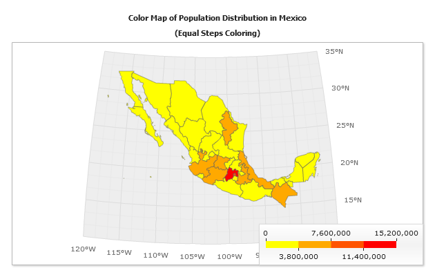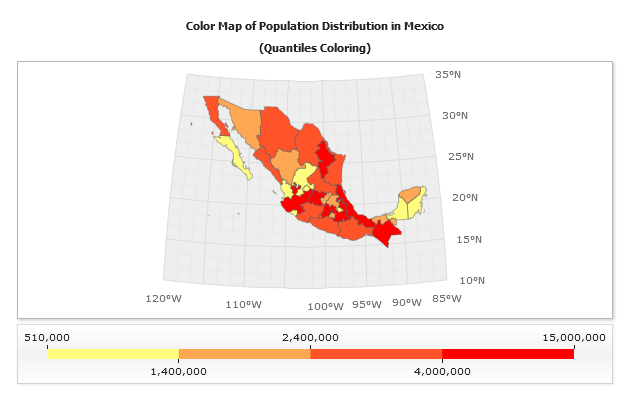 One of the obstacles of this threshold method is that it does not take into consideration how the data is distributed. Given population data is pretty much asymmetrical because Mexico State and Mexico City have a much higher population than the other states. This fact makes most of the other states to fall into the first step range and thus - the map loses a potential of showing difference in population.
