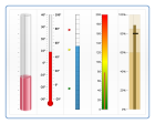 Vertical Linear Gauges, Vertical Bullet-Graphs. With Color-Ranges, Multiple-Axes, Custom Markers and Labels.