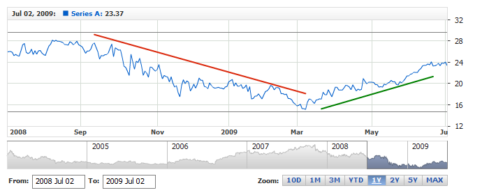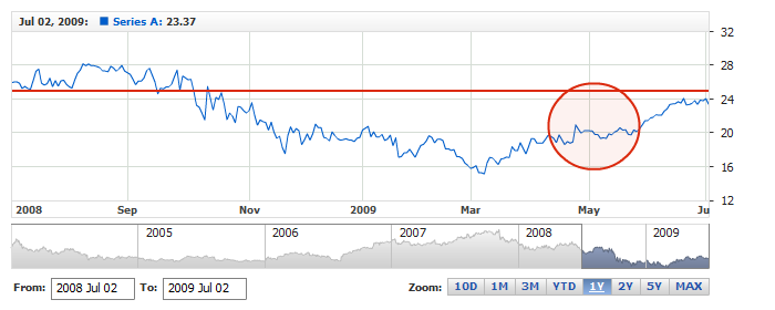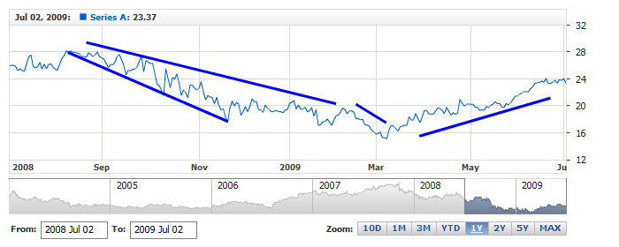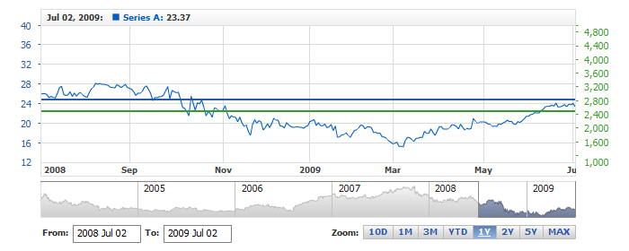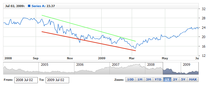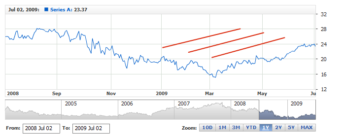 Live sample below contains two Horizontal Lines, one of them is bound to primary axis (shown on the left) and another is bound to extra Y axis (shown on the right):