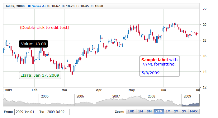 You can format text in Labels and for this formatting you have two important tools: first of all you can add and format {%Value} and {%Date} tokens which return value_anchor and time_anchor values. These tokens can be formatted as any other token in AnyStock, you can learn about that at: