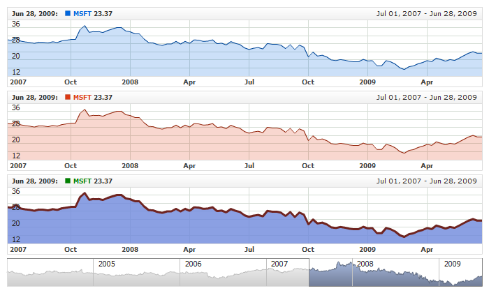 Live sample below shows to Area series, two of them use settings from defaults section and the third one uses personal settings with static colors defined: