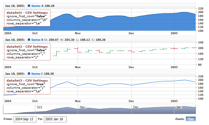 The CSV parser in AnyChart Stock supports Comma Separated Values format specifications, and some of the CSV parameters are configurable.
