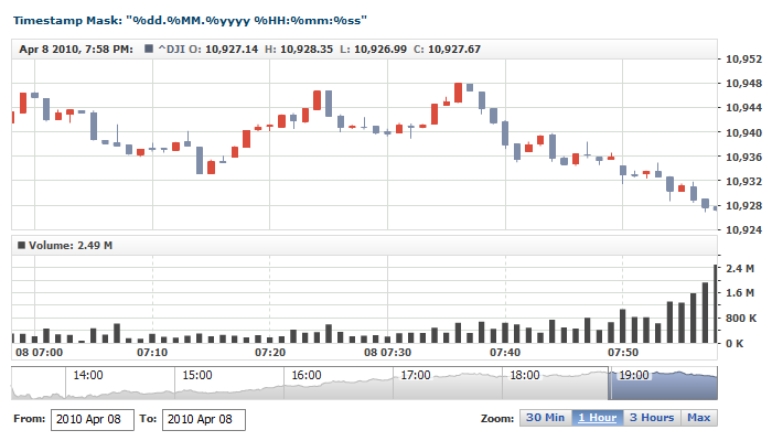 AnyChart Stock can accept and visualize date and time data at up to a millisecond precision. Every data set must contain the timestamp column, and its date-time format must be specified.