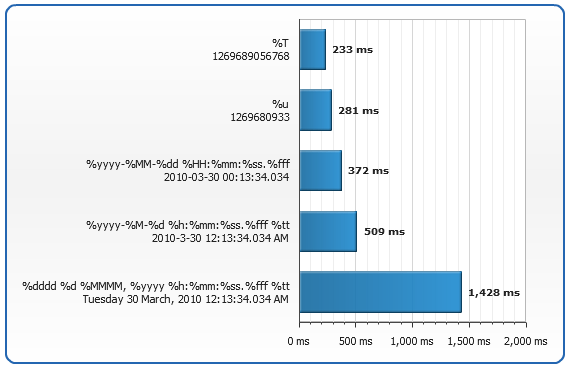 This chart shows the comparison of processing speeds for different timestamps - the bar names are timestamps formatting strings and samples, and the bar length is the processing time (in milliseconds) for 50.000 timestamps in the respective format: