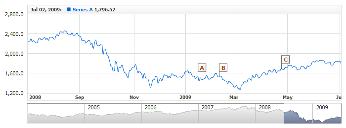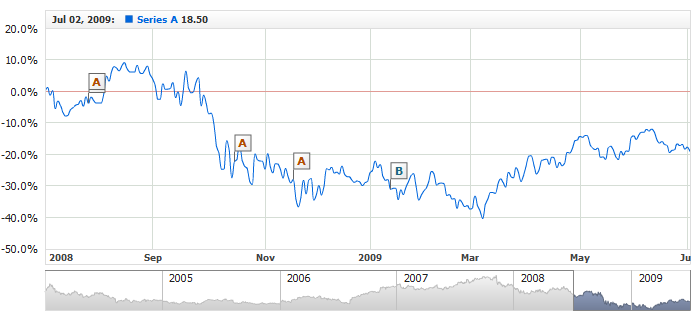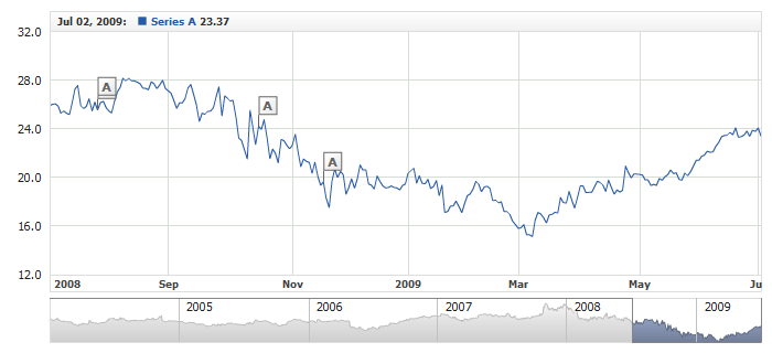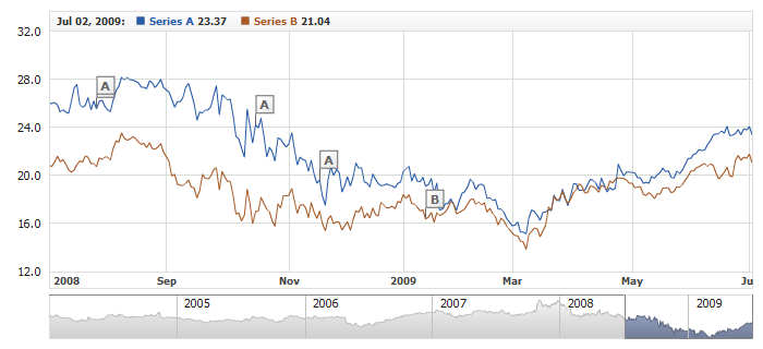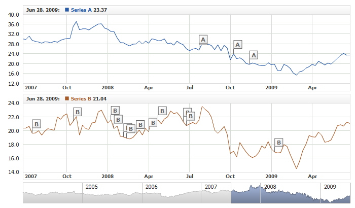 A group of event markers can be bound to any data series and even to technical indicators. It is also worth noticing that the binding works in any value axis mode; for example, in the comparison modes, covered in Y-Axes Settings.
