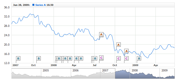 This article covers the mechanism of adding Event Markers to a chart in the configuration file. The component is capable of displaying a large number of event markers; technically, you are not anyhow restricted when forming the list. However, using more than 3000 markers simultaneously is not recommended, as it may seriously downgrade the performance of the component.