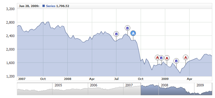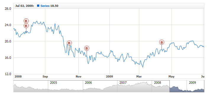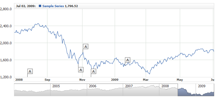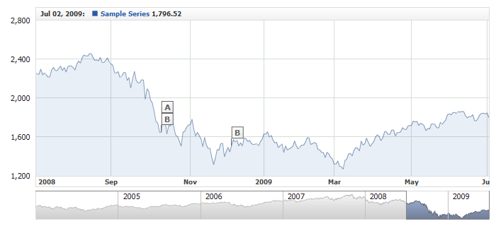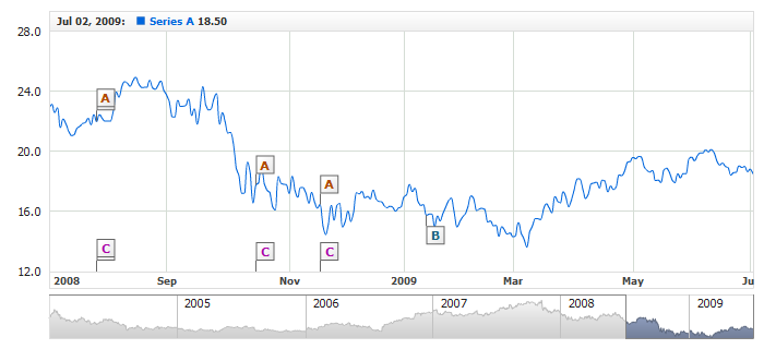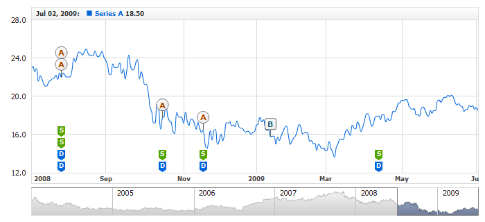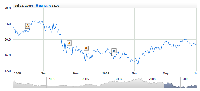 The AnyChart Stock component gallery has a special section demonstrating capabilities of event markers. It contains several examples for various visualization configurations.