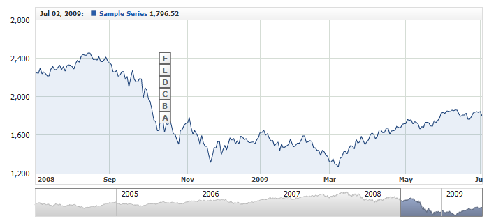 Event markers can be plotted in two positions: on a point in the series the group of markers is bound to or within the X-axis area. The position can be set for each specific marker or for an entire group of markers.