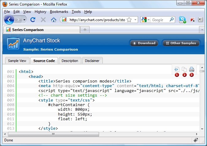 Sample View tab contains executable sample itself. Usually it is one chart and several html elements, which are needed for demonstration purposes.