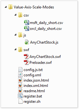 Sample file embedding Preloader.swf and AnyChartStock.swf, using the AnyChartStock.js library and the configuration component using XML (config.xml). Can be used as an example of a simple embedding of flash movie in an html page using a XML configuration. |