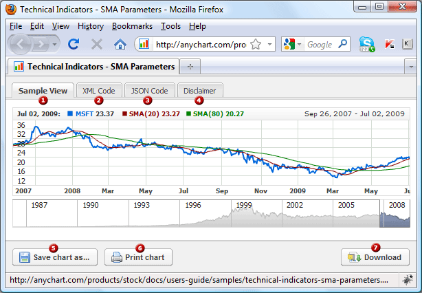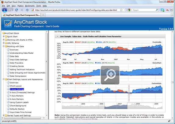 The documentation supplied with the AnyChart Stock component contains over 300 live samples. The "live sample" term stands for an image-like insertion in an article, which you can click on and view the sample in action in the new window.