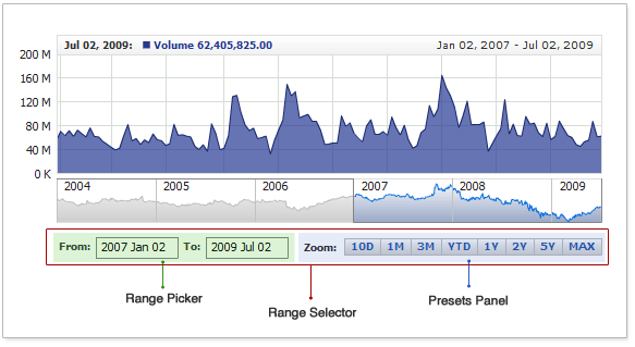 Range Selector Panel is a part of AnyChart Stock Component to make navigation though the large chart even more easy. The panel consists of two parts: