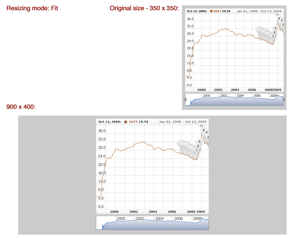 The size of the AnyChart Stock Component chart on the page is defined when you embed it, using AnyChartStock JavaScript Library API. Sometimes you may need to resize it later, and depending on the task you may need different resizing modes. Component offers four modes, three of them are similar to the resizing modes used in Show Chart in Full Screen feature.