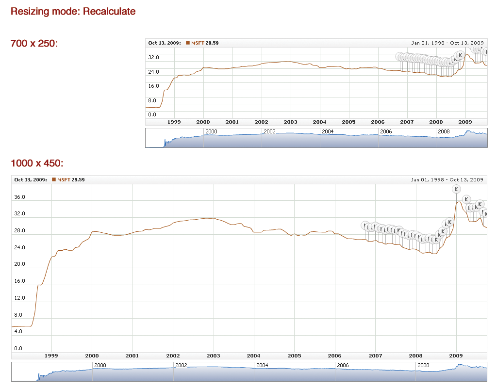 When resizing mode is set to "Recalculate" chart changes as if it is created in the new size - it means that chart parameters are recalculated, like, for example, the number of axis labels, grid lines and so on. Recalculate mode is the default resizing mode.