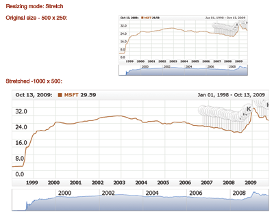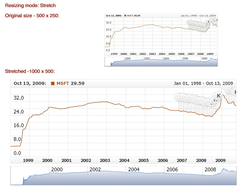 When resizing mode is set to "Stretch" the chart is stretched to the new size proportionally to the width and height of initial size or proportionally to baseWidth or baseHeight (if they are set).