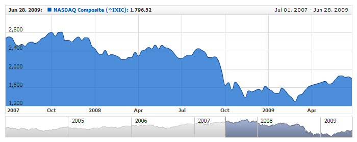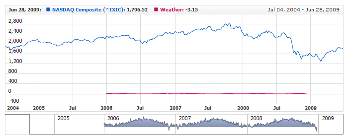 Sample below shows NASDAQ Composite(^IXIC) along with average temperature in Vancouver in the same period. Though, most likely, this phenomenon don't correlate we still can chart them at once and use temperature in Vancouver as the Scroller series: