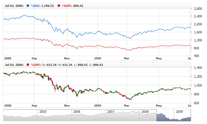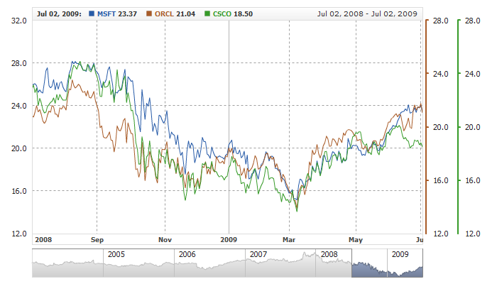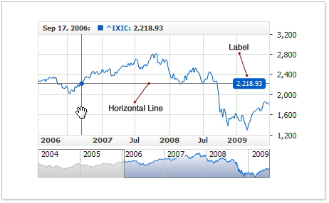 The AnyChart Stock component offers two additional elements for highlighting values under the mouse pointer. Those are Date Highlighter, which is an X-axis customization, and Value Highlighter, which is a customization of a specific series. These two elements together form an element known to end-users as Crosshair.