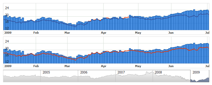 This live sample demonstrates the use of the RangeSplineArea and RangeBar type series with Value Highlighter: