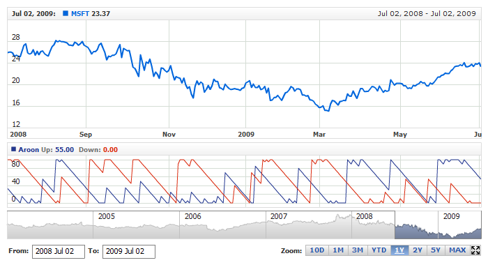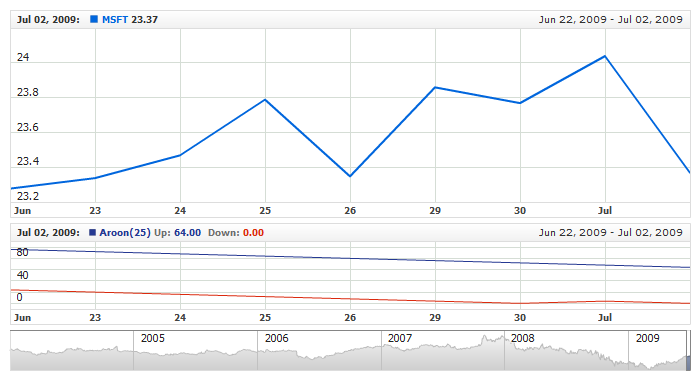 Aroon indicator settings are contained in <aroon_indicator> node, also in this node you can put two subnodes: <up_series> and <down_series> - these nodes define how exactly indicator is displayed on the chart. These nodes are identical to <series> node used to describe data series, so you can do with indicator anything you can do with series.