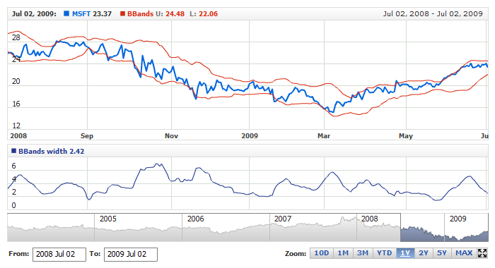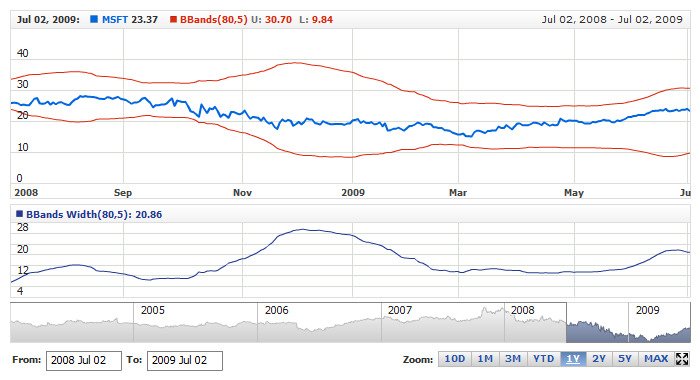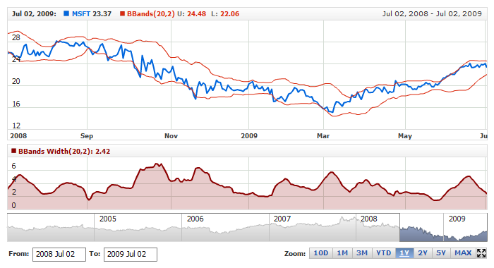 Bollinger BandWidth is an indicator derived from Bollinger Bands. In his book, Bollinger on Bollinger Bands, John Bollinger refers to Bollinger BandWidth as one of two indicators that can be derived from Bollinger Bands. The other indicator is BBands %B.