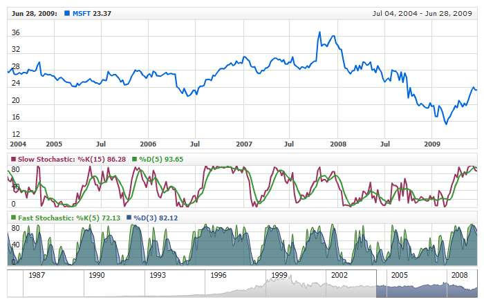 There are three subtypes of Stochastic Oscillator - Fast Stochastic, Slow Stochastic and Full Stochastic. AnyChart Stock allows adding only the Full Stochastic Indicator; however, you can use it to create the Fast and Slow subtypes as well.
